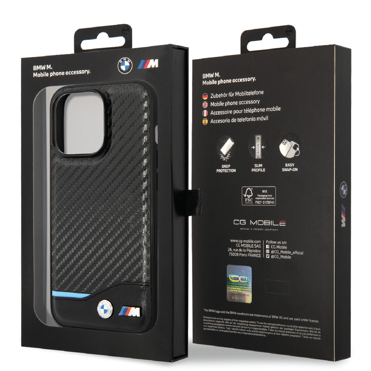 BMW M Collection Magsafe Compatibility PU Carbon Case with Bottom Horizontal Blue Line iPhone 14 Pro Compatibility - Black