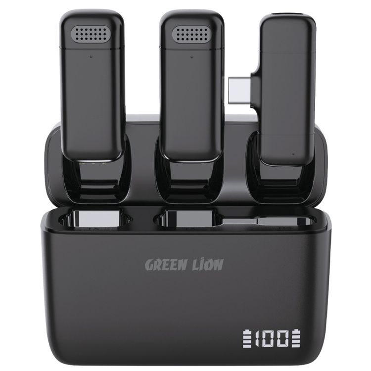 جهاز مايكروفون لاسلكي Green Lion Duo Cast من نوع Type-C مع زمن عمل يصل إلى 7 ساعات، نقل لمسافات طويلة، إقران تلقائي، توصيل وتشغيل، خفيف الوزن وصغير الحجم - أسود