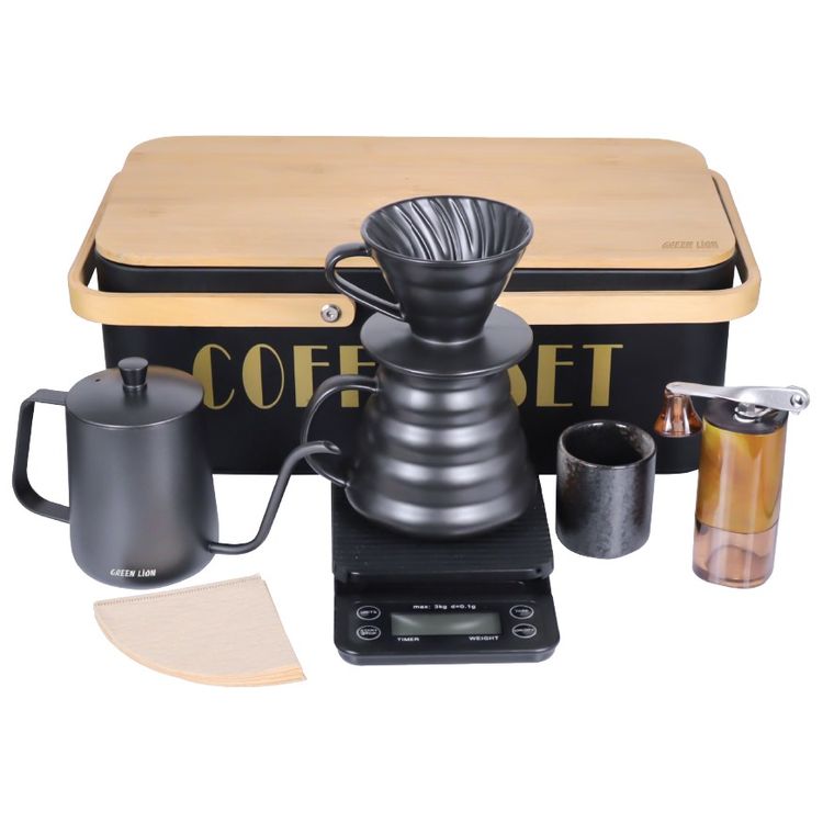 مجموعة ماكينة صنع القهوة 8 في 1 باللون الأسود سعة 600 مل من جرين ليون G-70، صندوق معدني بمقبض خشبي - أسود