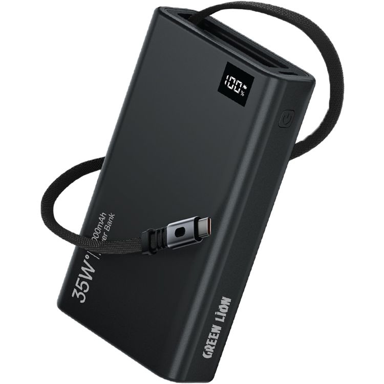 باور بانك جرين لايون 10000mAh قابل للسحب بقدرة 35W، مع شاشة LED، طول الكابل 75 سم، منفذ Type-C، دعم الشحن السريع - أسود