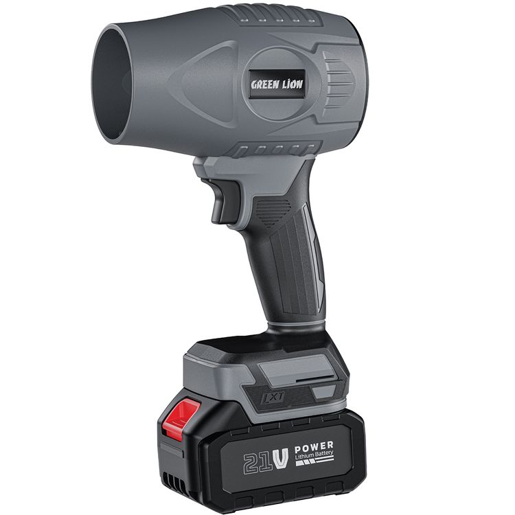 منفاخ Green Lion Storm Jet بلا أسلاك مع بطارية قابلة للفصل بقوة 21V، محرك بدون فرشاة ورياح قوية جدًا، نطاق 36,000 دورة في الدقيقة، بقوة 1000 واط - رمادي.