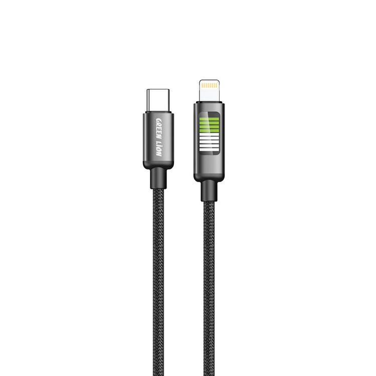كابل شحن Green Lion USB-C إلى Lightning مزود بمؤشر LED، مصنوع من الألومنيوم ونسيج مضفر، بطول 1 متر، آمن ومضمون، متوافق على نطاق واسع، مؤشر LED - اللون الأسود.