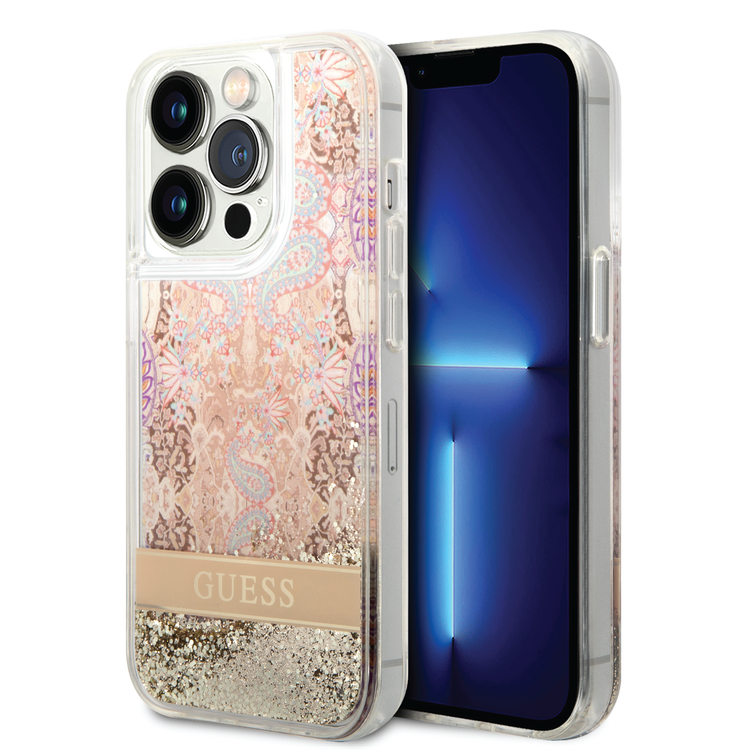 كفر حماية Guess Liquid Glitter بتصميم الزهور، لامع للغاية، ملمس ناعم، متوافق مع iPhone 14 Pro Max - ذهبي