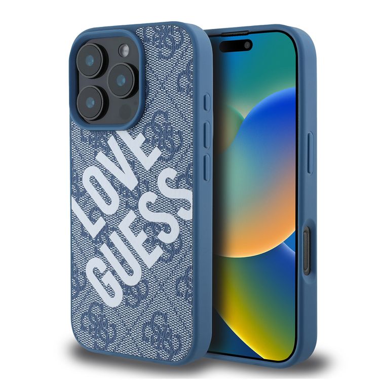 كفر حماية Guess PU 4G الصلب مع شعار Big Love Guess لهاتف iPhone 16 Pro، مصنوع من مادة عالية الجودة، خفيف الوزن، سهل التركيب - أزرق