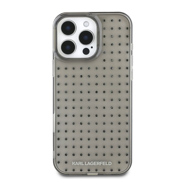 كارل لاغرفيلد IML غطاء صلب شفاف مزود بمسامير في كل مكان لجهاز iPhone 16 Pro، تصميم شعار مطبوع - أسود شفاف