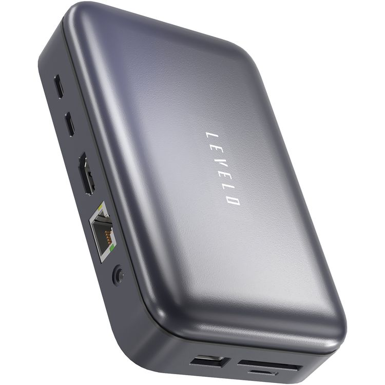 قاعدة تخزين ليفيلو فيرسابورت 10 في 1، تصميم مضغوط، مجموعة متنوعة من الموصلات، منفذ ميكروفون/صوت 2 في 1، توصيل طاقة 100 وات، 4K@60 هرتز HDMI - رمادي
