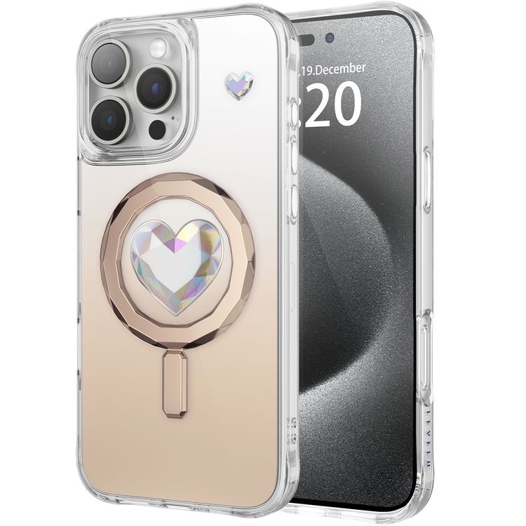 جراب Levelo Hearts Magsafe لهاتف iPhone 16 Pro بتصميم قلب ثلاثي الأبعاد، مضاد للاصفرار، مضاد لبصمات الأصابع، هيكل هجين، كريستال قلب سواروفسكي، متوافق مع MagSafe - ذهبي وردي / شفاف