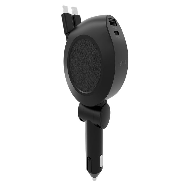 شاحن سيارة مصنوع من جلد سافيانوس بتقنية 4 في 1 من ليفيلو أوربيس مع كابلين مدمجين وقابلين للسحب من نوع C، ومنفذ إخراج USB-A و USB-C، وطول الكابلات القابلة للسحب 80 سم - أسود