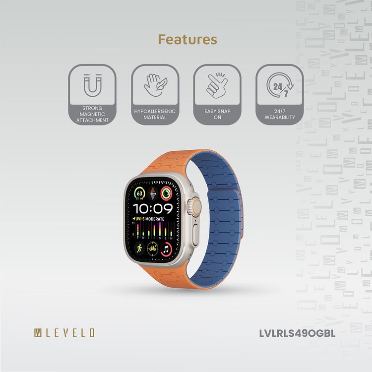 حزام ساعة سيليكون بمستويين من الألوان من روياللينك لساعة أبل 49/46 ملم، مصنوع من مواد مضادة للحساسية، يحتوي على 32 مغناطيس مدمج، مقاوم للماء والعرق، بملحق مغناطيسي قوي، سهل التركيب - برتقالي / أزرق
