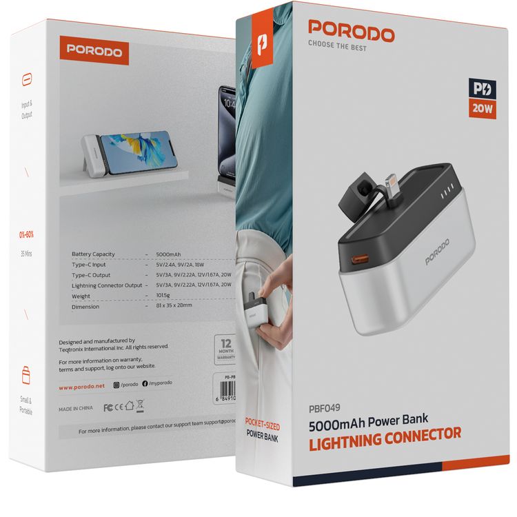 بورودو باور بانك بسعة 5000 مللي أمبير مع موصل لايتنينج، بقوة 20 واط لتوصيل الطاقة، صغير ومحمول، شحن من 0% إلى 60% في 35 دقيقة، بحجم الجيب - أبيض
