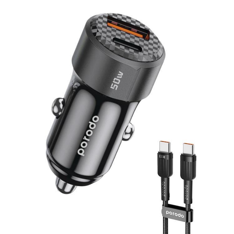 شاحن سيارة Porodo 50 وات بمنفذين مع كابل USB-C إلى USB-C، إجمالي خرج 50 وات، شحن متزامن، محمول، طول الكابل 1 متر - أسود