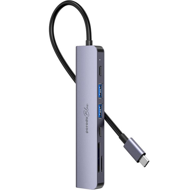 موزع USB-C من Porodo Blue مزود بـ 7 منافذ بدقة 4K HDMI وUSB-C مزدوج، 100 وات PD، قارئ بطاقات، التوصيل والتشغيل، قابل للتبديل السريع، نظام التشغيل Windows/Mac OS/Android - رمادي