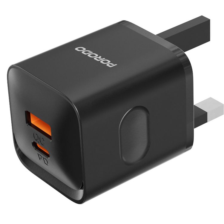شاحن حائط بمنفذين من بورودو، قابس المملكة المتحدة، QC 20 وات، PD 20 وات، حماية من الحرارة الزائدة، شحن متزامن، رفيق موثوق - أسود