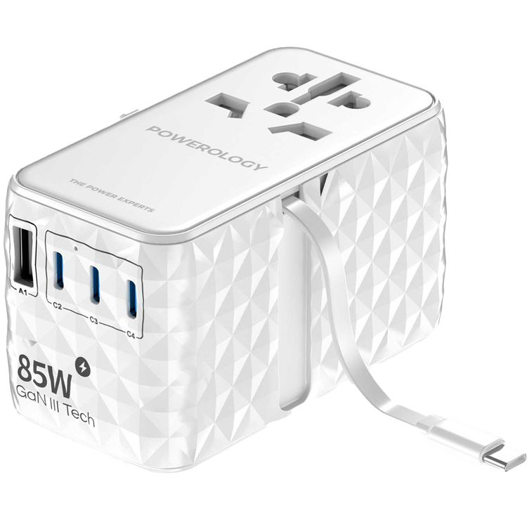 محول Powerology العالمي شاحن فائق 85 واط مع كابل من النوع C - أبيض