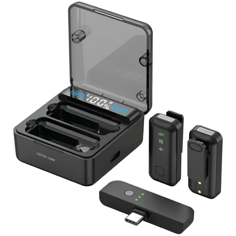 ميكروفون 2 في 1 من Green Lion بشاشة رقمية، تقليل الضوضاء، زمن انتقال منخفض، بطارية تدوم طويلاً، وقت عمل 5 ساعات، نقل لاسلكي، خفيف الوزن، محمول وصغير الحجم - أسود