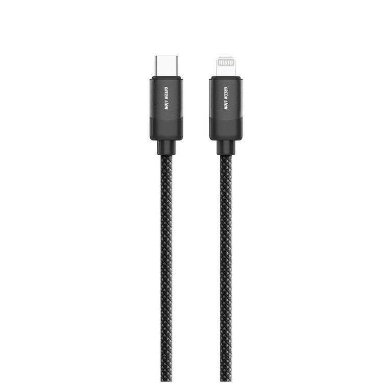 كابل Green Lion USB-C إلى Lightning مضفر مع عمر يصل إلى 10000 انحناء، بطول 1 متر، قدرة تيار 27 واط، للشحن والمزامنة، آمن ومضمون، بسرعة نقل 480 ميجابت في الثانية - أسود