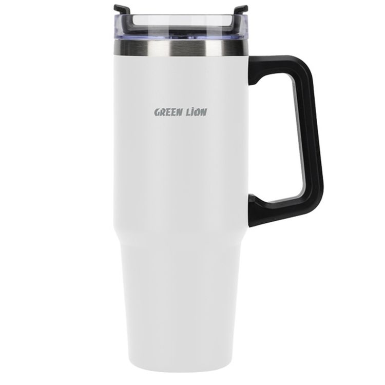 كوب سفر "جرين ليون" العازل للمكنسة، يحافظ على السخونة لمدة 16 ساعة والبرودة لمدة 24 ساعة، مصنوع من الفولاذ المقاوم للصدأ، مزود بمقبض مريح وقابل للحمل، فتحة واسعة جداً، ملائم لحامل الأكواب - أبيض