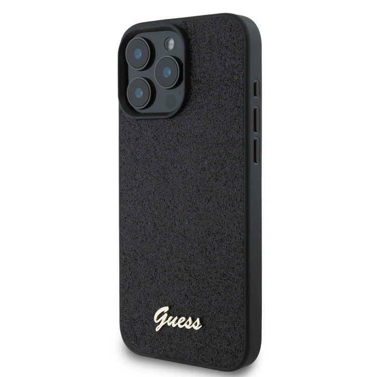 جراب Guess Fixed Glitter Hard Case مع شعار معدني مكتوب عليه Script لهاتف iPhone 16 Pro، تصميم رفيع، حماية من السقوط، سهل التركيب، مادة عالية الجودة، حماية إضافية - أسود
