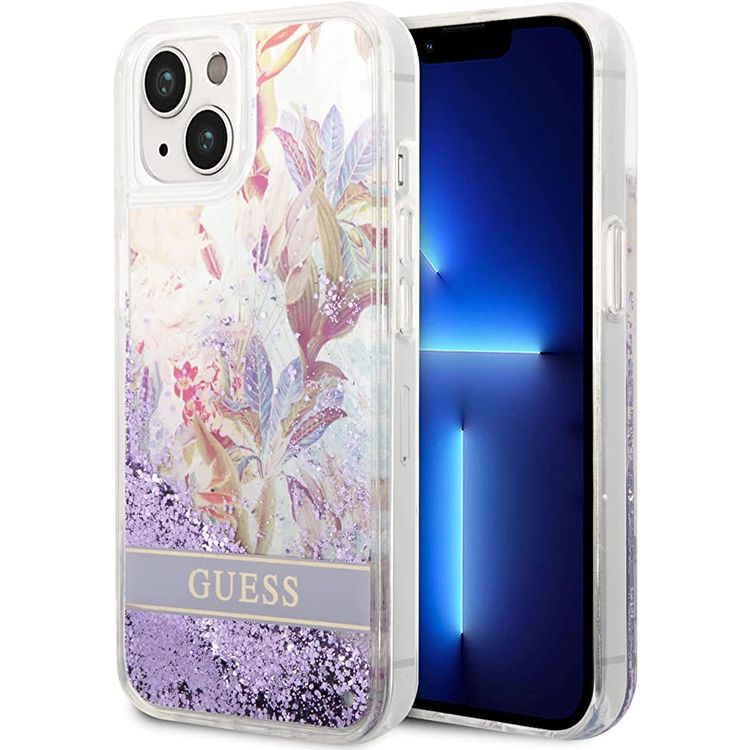 كفر حماية Guess Liquid Glitter بتصميم الزهور، لامع للغاية، ملمس ناعم، متوافق مع iPhone 14 Plus - بنفسجي