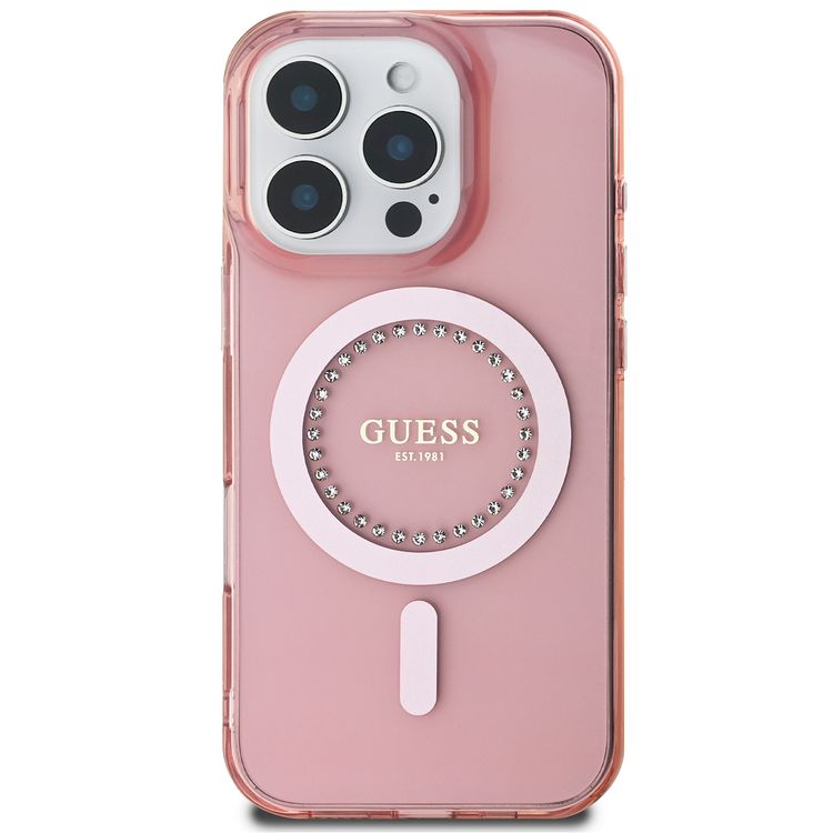 غطاء GUESS MagSafe IML صلب مع تصميم أحجار الراين لهاتف iPhone 16 Pro Max، سهل التركيب، حماية من السقوط، نحيف - وردي