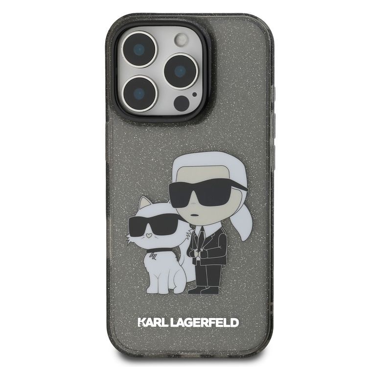 جراب Karl Lagerfeld IML اللامع الصلب مع شعار Karl & Choupette NFT لهاتف iPhone 16 Pro Max، ممتص للصدمات والسقوط، فتحات دقيقة، قبضة مريحة، سهل التركيب - أسود