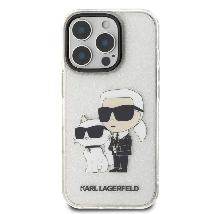 جراب Karl Lagerfeld IML اللامع الصلب مع شعار Karl & Choupette NFT لهاتف iPhone 16 Pro، ممتص للصدمات والسقوط، فتحات دقيقة، قبضة مريحة، سهل التركيب - شفاف