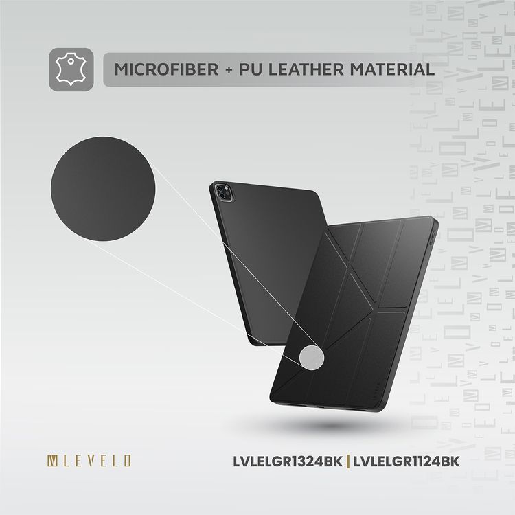 حافظة ليفيلو إيليجانت هجينة من الجلد لجهاز آيباد برو 13" (2024)، تتميز بتوجيه عمودي وموضع أفقي، واقي صدمات، حماية بزاوية 360°، سهلة التركيب، وفتحات دقيقة - اللون الأسود