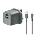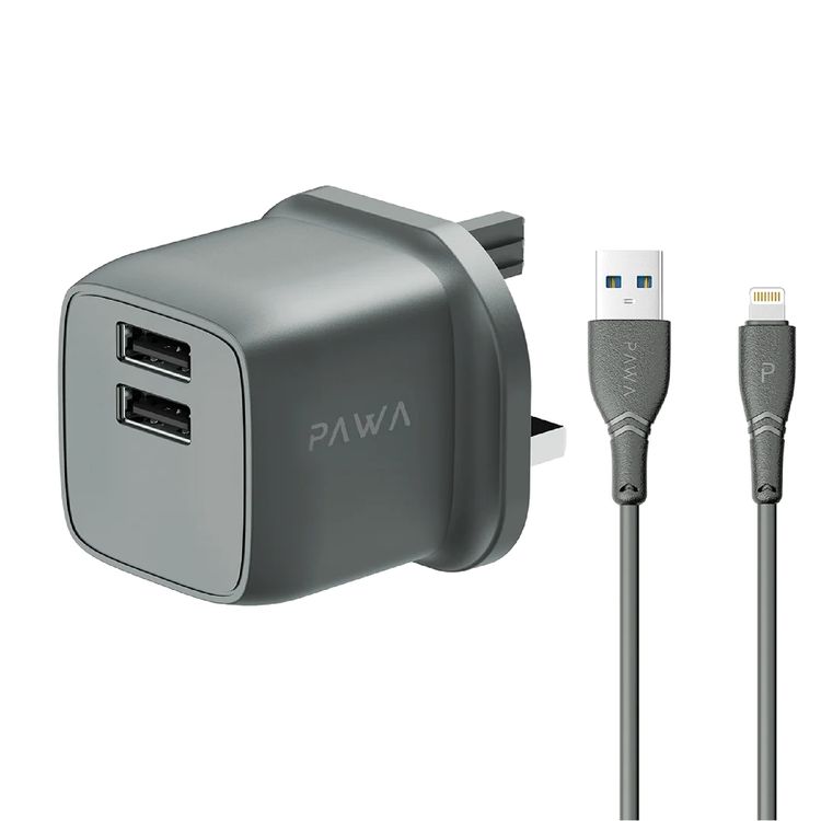شاحن السفر PAWA PocketMini ثنائي USB وكابل USB-A القياسي إلى Lightning في المملكة المتحدة - رمادي