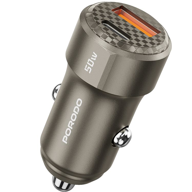 شاحن سيارة بورت مزدوج من بورودو بقدرة 50 واط، توصيل طاقة بقوة 20 واط، شحن سريع متزامن، شاحن سريع بقوة 30 واط، حماية متعددة، تصميم من ألياف الكربون، خفيف الوزن ومحمول - تيتانيوم.