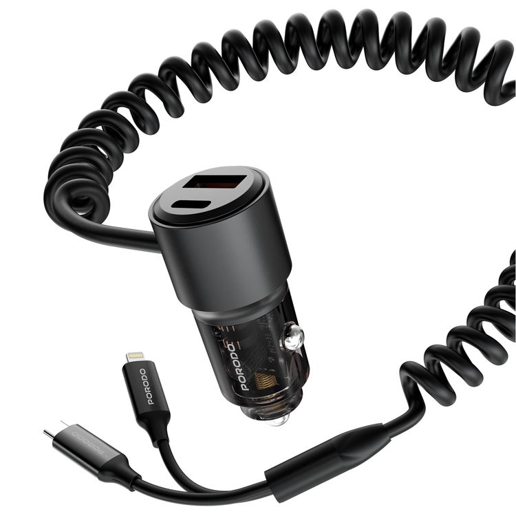 شاحن سيارة Porodo بقوة 95 وات، منافذ USB-A وC، مدخل 12-24 فولت، كابل ملفوف زنبركي بطول 1.5 متر، كابلات USB-C وLightning مدمجة