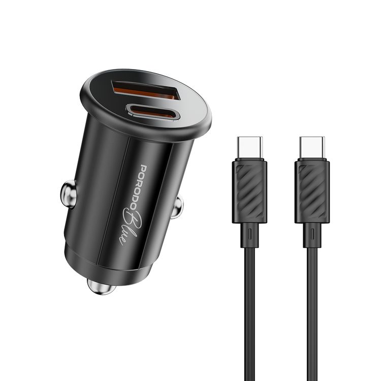 شاحن سيارة بورودو الثنائي المنافذ بقوة 30 واط باللون الأزرق مع كابل من نوع Type-C إلى Type-C، منافذ USB-C وUSB-A، مع إخراج مشترك بقوة 15 واط، مصنوع من مادة البولي كربونات - باللون الأسود.