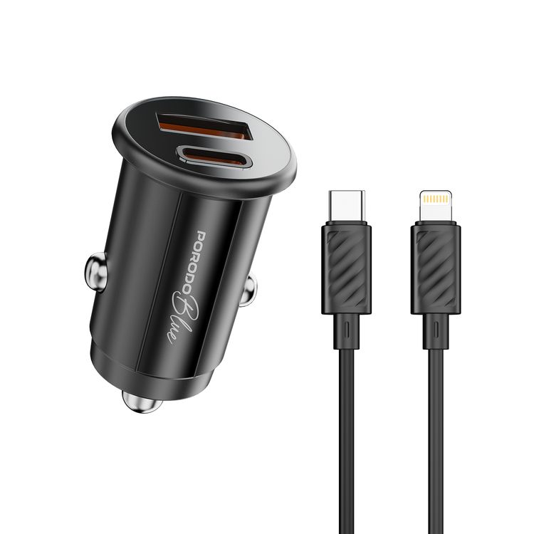 شاحن سيارة بورودو بلو ثنائي المنافذ بقوة 30 واط مع كابل من نوع C إلى لايتنينغ، يحتوي على منافذ USB-C و USB-A، قوة خرج مشتركة 15 واط، مادة البولي كربونات - أسود.