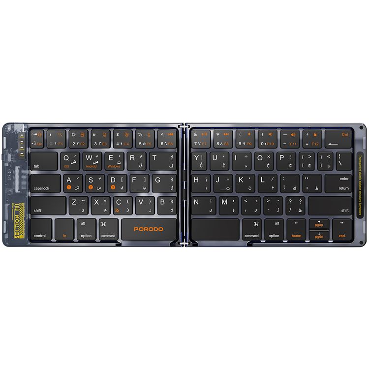 لوحة مفاتيح بلوتوث لاسلكية شفافه من بورودو كريستال شيل، قابلة للطي، 65 مفتاحًا + تخطيط عربي، بطارية ليثيوم 80 مللي أمبير، مفاتيح مقصية، متوافقة مع ويندوز وiOS وأندرويد وماك - أسود