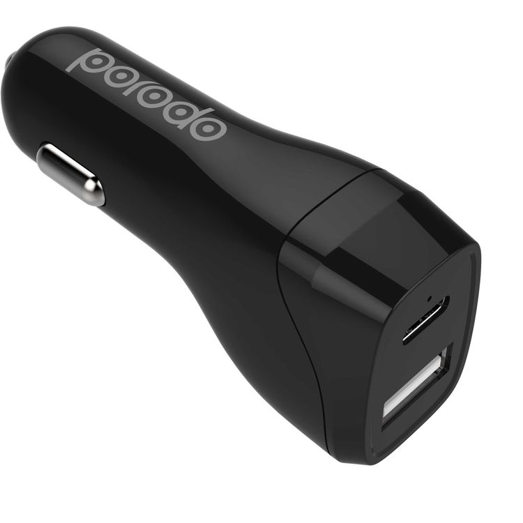 شاحن سيارة محمول مزدوج المنفذ 30W / PD 18W USB-A - منافذ USB-C شحن سريع محول طاقة السيارة متوافق مع iPhone - محول ولاعة سجائر السيارة بتصميم مدمج من Porodo - أسود