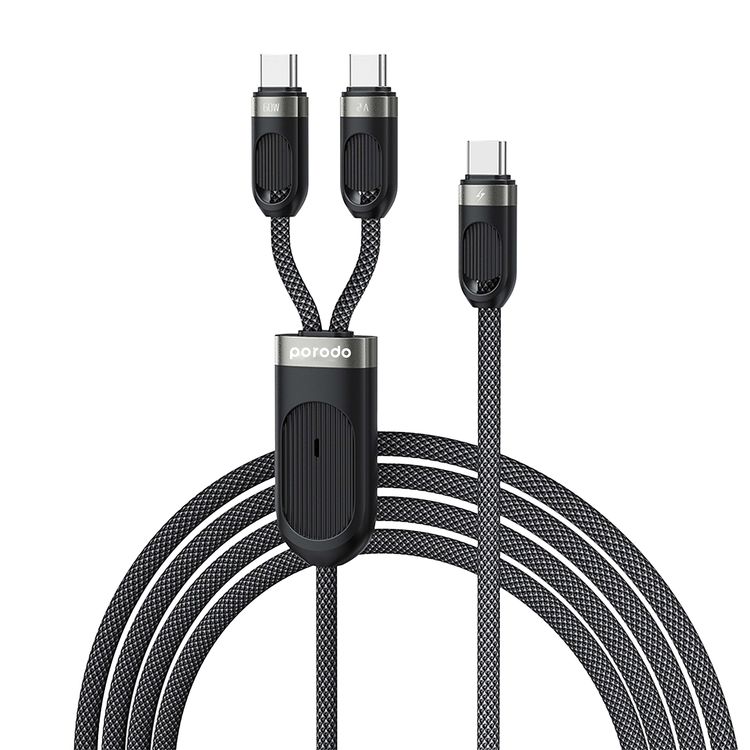 كابل شحن سريع مزدوج من Porodo بمدخل USB-C PD، شحن متزامن، سلك مضفر، توافق عالمي، طول الكابل 1.2 متر، 60 وات PD - أسود