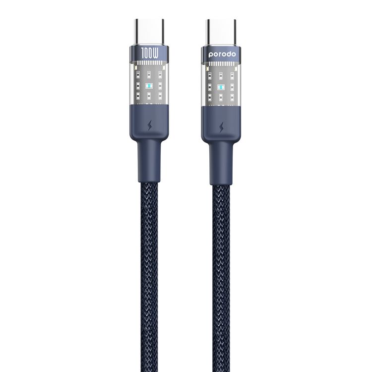 كابل Porodo Braided من USB-C إلى USB-C بقدرة توصيل طاقة تصل إلى 100 واط، يتحمل أكثر من 15000 انحناء، خالٍ من التشابك، مكونات عالية الجودة، بطول 1.2 متر - أزرق
