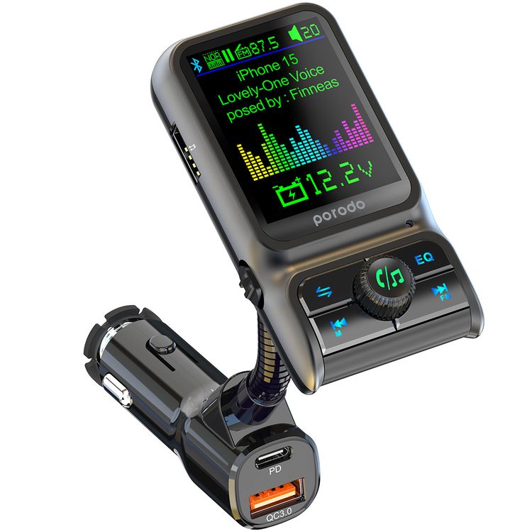 شاحن سيارة بورودو مع شاشة ملونة بحجم 1.77 بوصة، PD بقوة 36 واط، يدعم ذاكرة USB فلاش تصل حتى 32 جيجابايت، ميكروفون مدمج، FM، TM، قارئ بطاقات TF، بلوتوث بمدى 10 أمتار - أسود