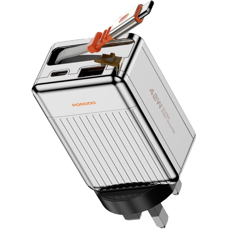 شاحن Porodo Super Quick GaN مع كابل من النوع C القابل للسحب بطول 75 سم، قوة 42 واط، شحن متزامن، مخرج USB-A بقوة 22.5 واط، ضوابط أمان مدمجة - فضي