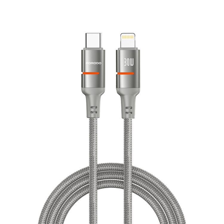 كابل برودو Type-C إلى Lightning مضفر مع توصيل طاقة 30 واط، بطول 3 أمتار، للشحن السريع ونقل البيانات، تصميم يمنع التشابك - رمادي