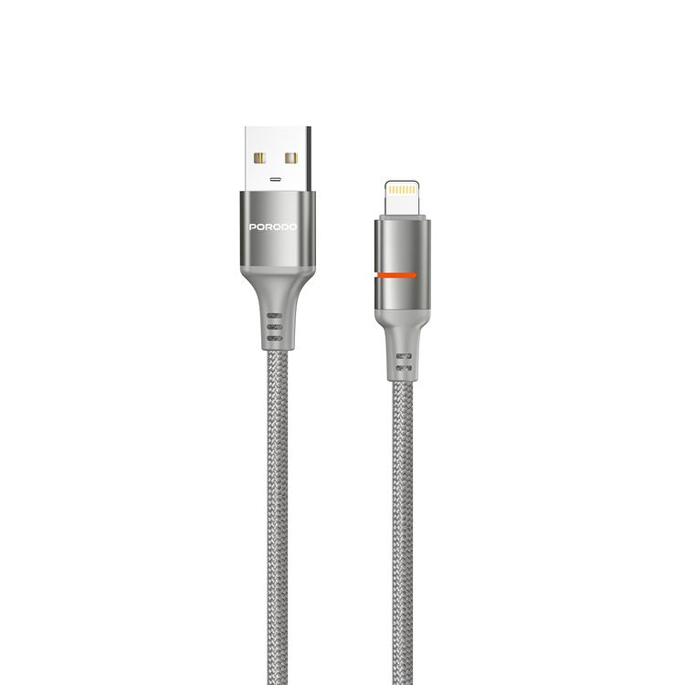 Porodo كابل USB-A إلى Lightning بإضاءة LED مع تيار 2.4A، سرعة نقل تصل إلى 480Mbps، طول الكابل 1.2 متر، شحن سريع ونقل بيانات، سلك مضفر - رمادي
