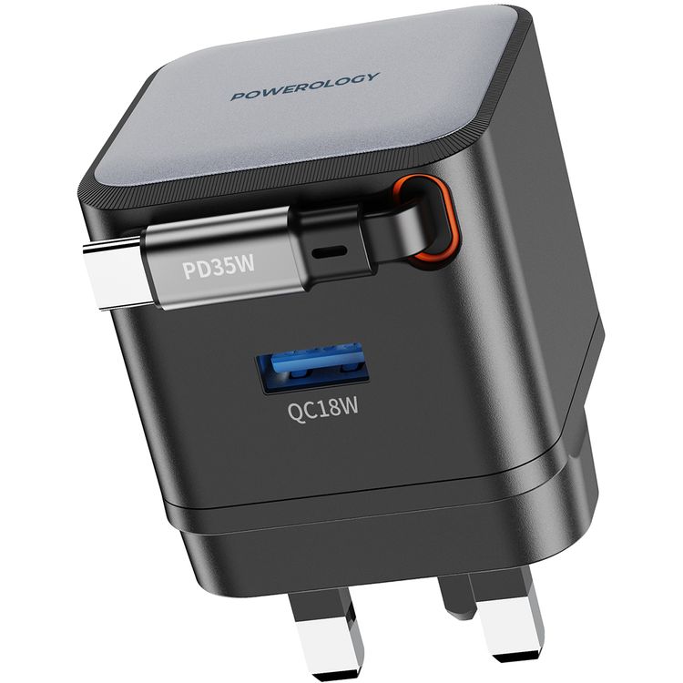 شاحن باورولوجي بمدخلين قابل للسحب بتقنية GaN، مزود بحمايات مدمجة، لشحن جهازين، يوفر طاقة 35 واط، مصنوع من مواد مقاومة للحريق، تصميم مسجل ببراءة اختراع، كابل نوع-C قابل للسحب بطول 75 سم - أسود