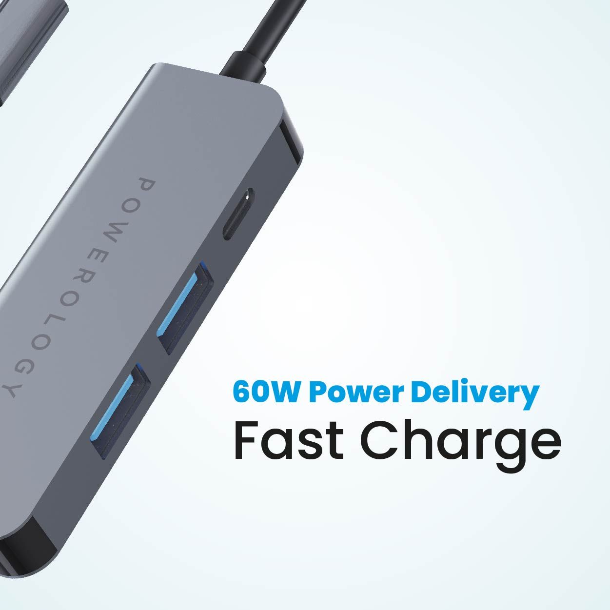 محطة طاقة باورولوجي USB-C 4 في 1 للشحن، HDMI بدقة 4K وUSB 3.0 بقوة 60 واط - اللون الرمادي