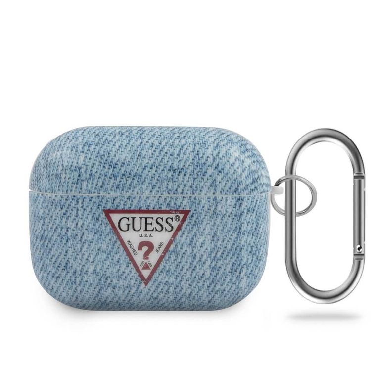 CG Mobile Guess Denim Triangle Case with Anti-Lost Carabiner Compatible for AirPods Pro, Scratch & Drop Resistant, Dustproof & Absorbing Protective Cover Suitable with Wireless Charger Officially Licensed - Light Blue