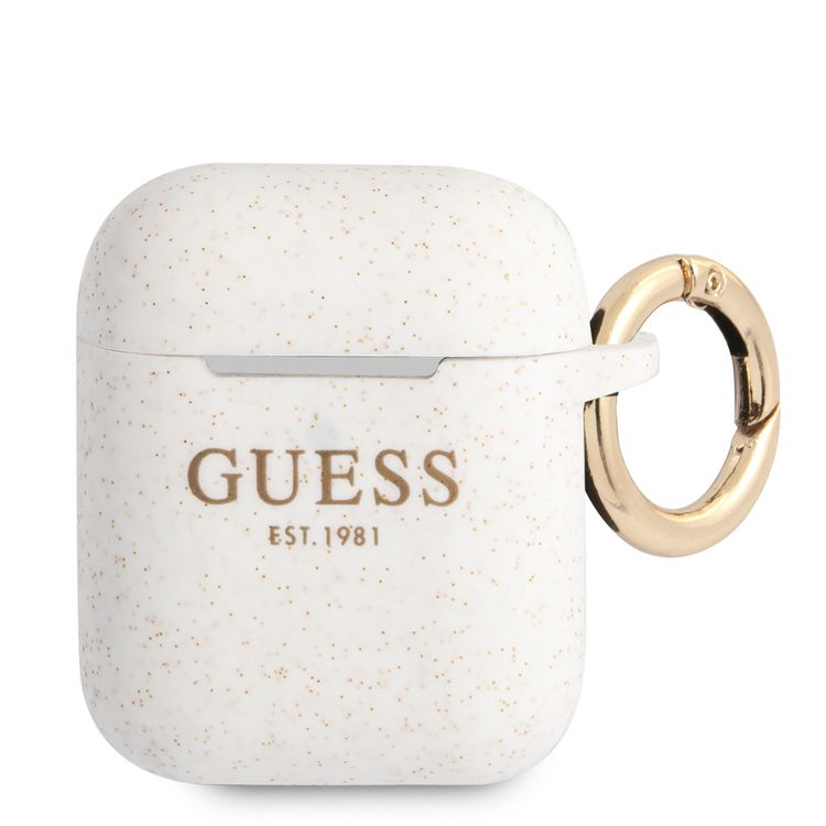 CG MOBILE Guess Silicone Glitter Case with Anti-Lost Ring Compatible for AirPods 1/2, Scratch Resistant, Shock Absorption & Drop Protection Cover Officially Licensed - White