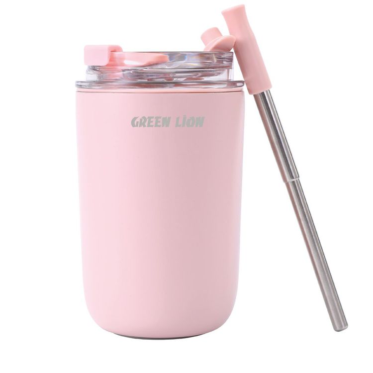 Green Lion Vacuum Travel Mug Lite, 280 mL Capacity, Keeping Hot for 6 Hours and Cold for 12 Hours, Food Grade Silicone Straw, Food Grade Stainless Steel Cup - Pink