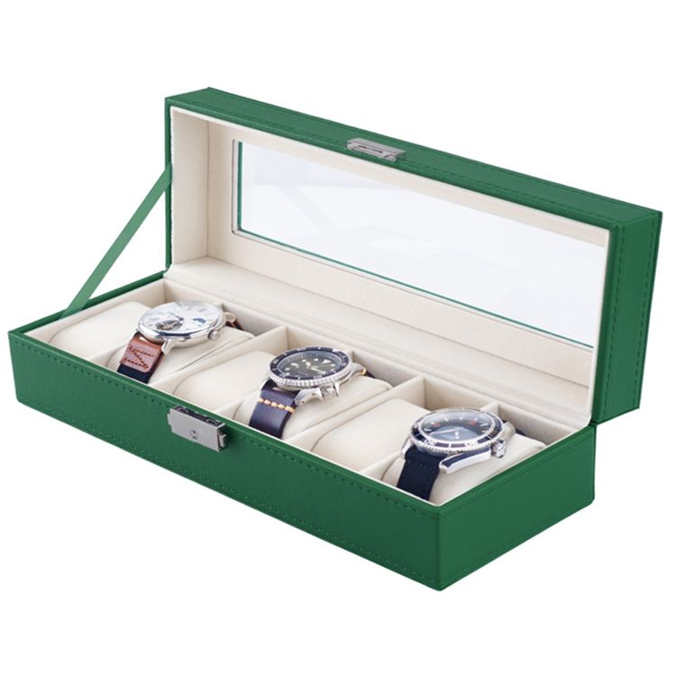 Green Lion Classic Watch Box 6 Slots with Glass, Lightweight & Portable, Elegant Appearance, Metal Push Button, 6 Pillow-lined Spaces - Green