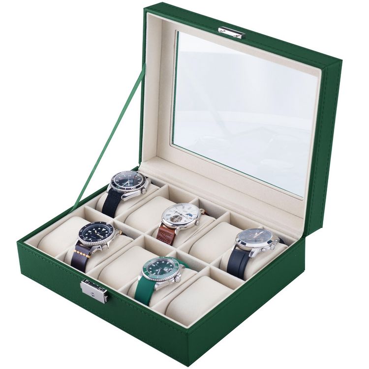 Green Lion classic Watch Box 10 Slots with Glass, Lightweight & Portable, Elegant Appearance, Metal Push Button, 10 Pillow-lined Spaces - Green