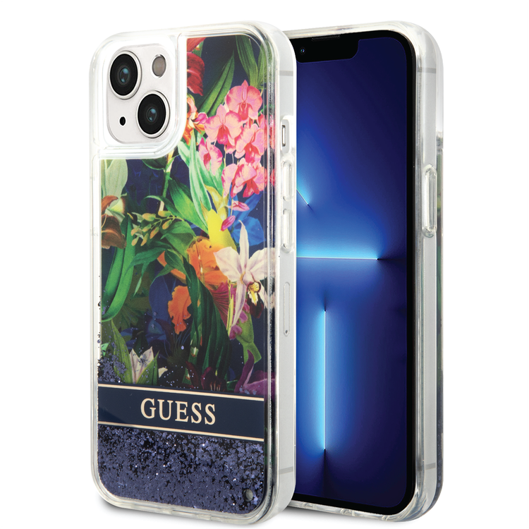 Guess Liquid Glitter Case with Flower Pattern Extra Shine Smooth Touch Feel iPhone 14 Plus Compatibility - Blue