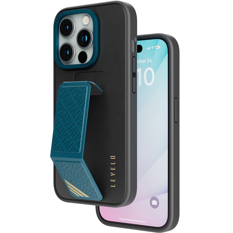 Levelo Morphix Leather Case for iPhone 15 Pro with Kickstand Grip - Black/Blue