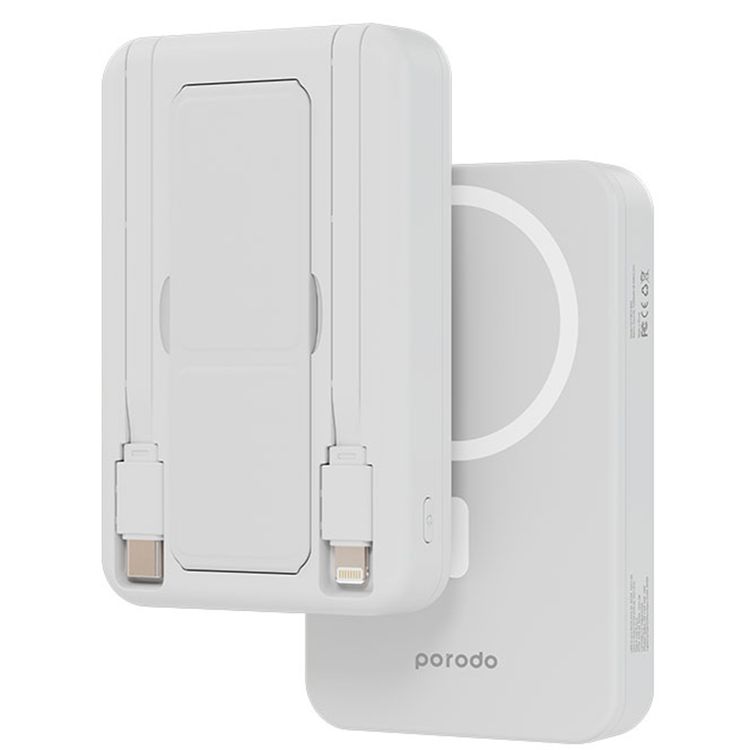 Porodo 10000mAh Magsafe Powerbank Attach with Built-in Type C and Lightning Cable, Wireless Charging, 2 Hours Charging Time with Stand - White